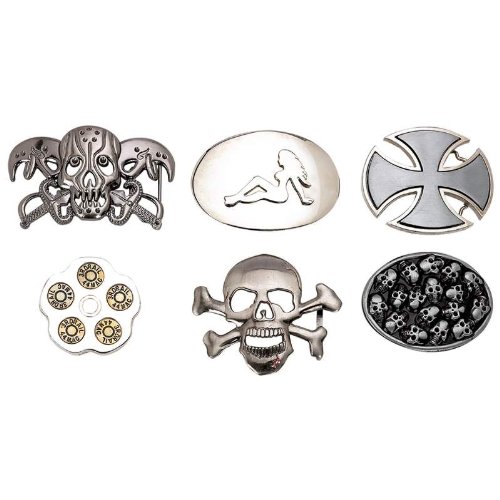 Diamond Plate 6pc Assorted Belt Buckle SetSet includes: 3-1/2" x 3" Maltese cross, 4" x 3-3/8" skull and crossbones, 3-5/8" x 2-3/4" oval buckle with multiple skulls, 4-1/2" x 2-3/4" horned skull with crossed swords, 2-3/4" revolver chamber, and 4" x 2-3/4" oval buckle with woman. All buckles are made of heavy-gauge steel. Buckles not sold individually. We only sell in complete 6pc sets.